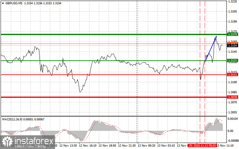 The price test at 1.3111 occurred when the MACD indicator had just begun to move downward from the zero mark, confirming a correct entry point for selling the pound. Together with weak U.K. data, this suggested the possibility of a strong decline in the pair. nHowever, that decline never materialized, and losses were eventually recorded. Then, a price test at 1.3131 coincided with the MACD starting to move upward from the zero mark, providing a buy signal, after which the pair rose toward the target level of 1.3170.
