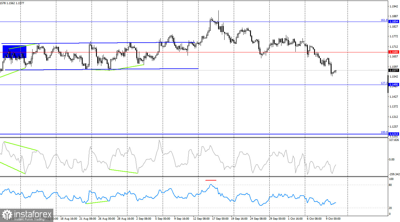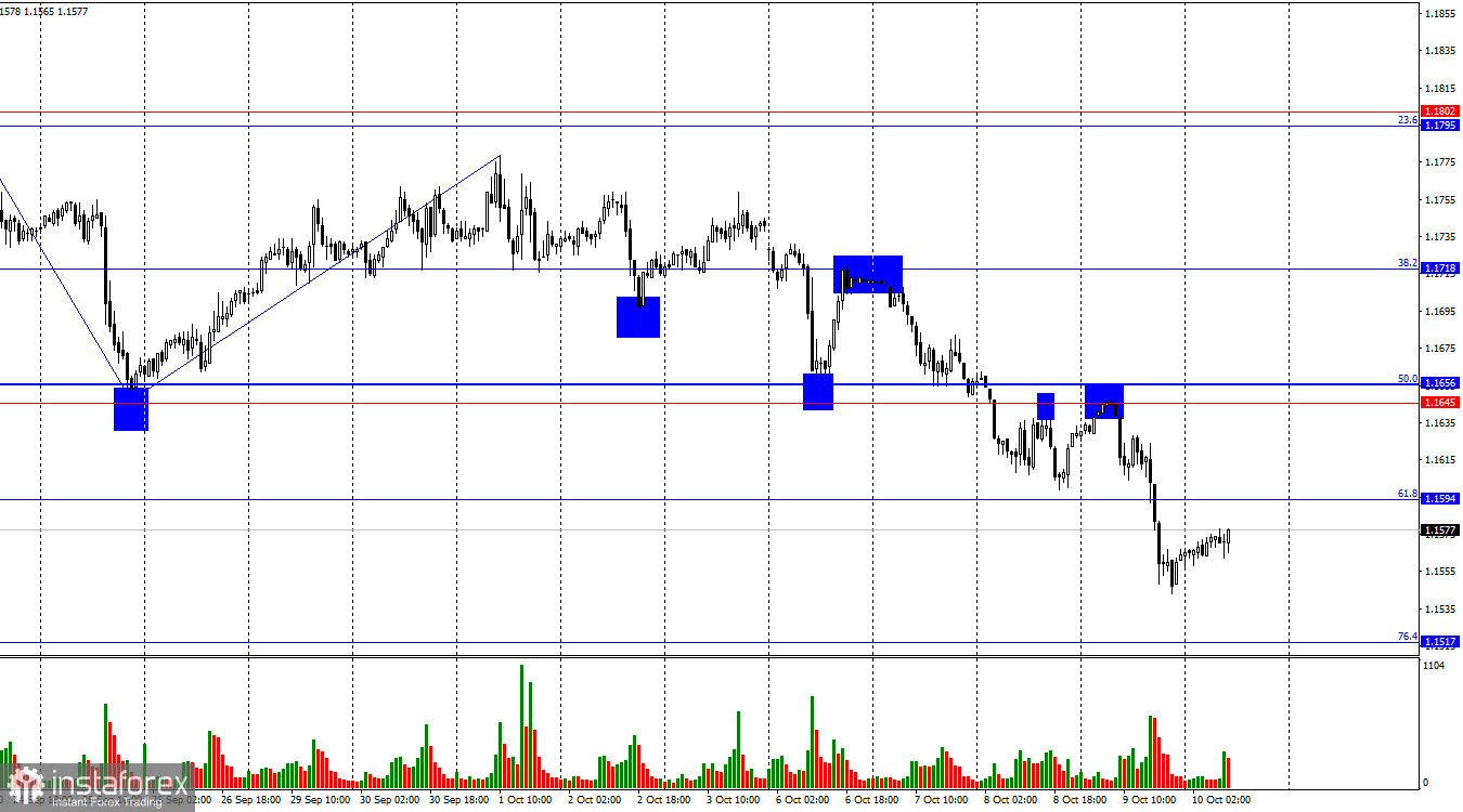 La situation des vagues sur le graphique horaire reste simple et claire. La dernière vague haussière complétée n'a pas dépassé le sommet de la vague précédente, tandis que la nouvelle vague baissière a cassé le plus bas précédent. Ainsi, la tendance actuelle reste baissière. Cependant, les dernières données du marché du travail et les perspectives changeantes de la politique monétaire de la Fed soutiennent les acheteurs, raison pour laquelle je m'attends à voir la tendance devenir haussière. Pour que la tendance baissière prenne fin, le prix doit se consolider au-dessus du dernier sommet à 1,1779.