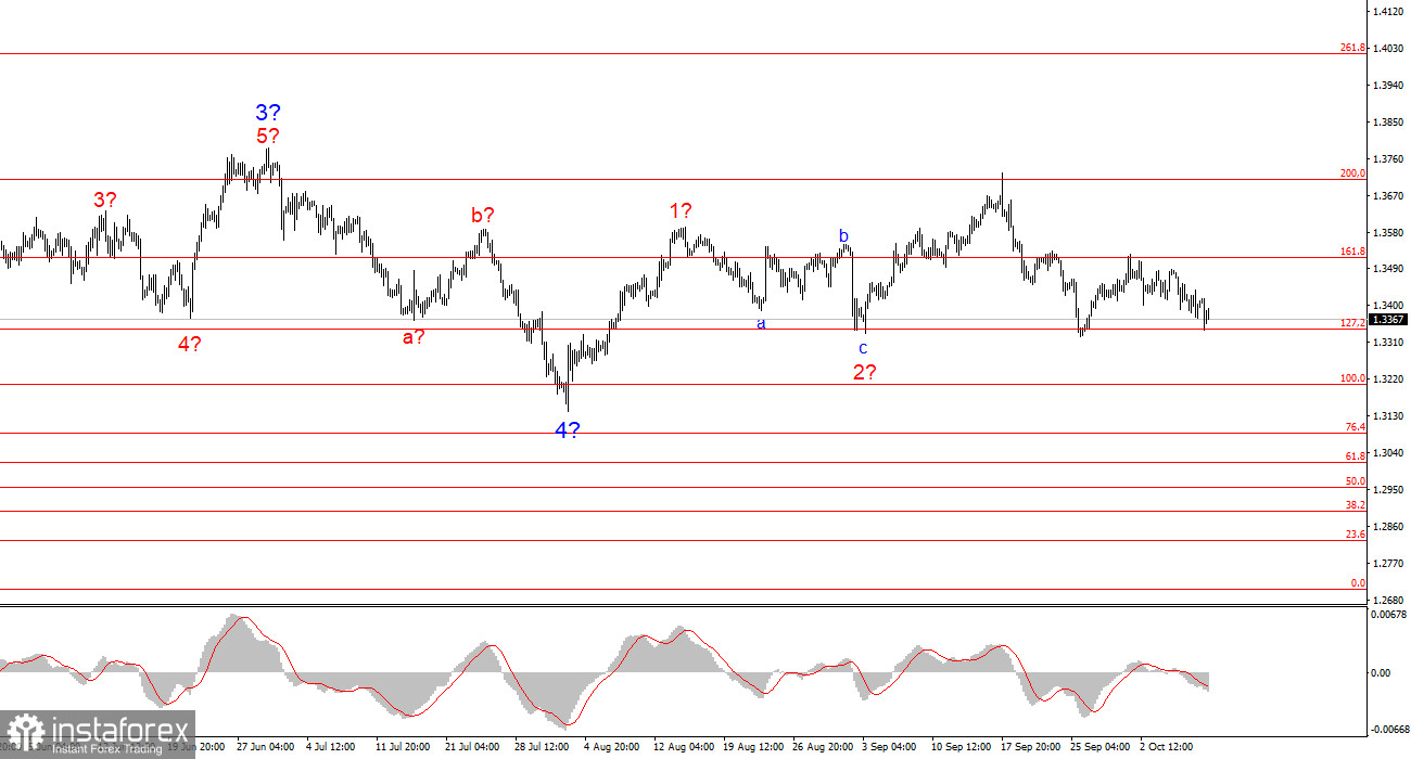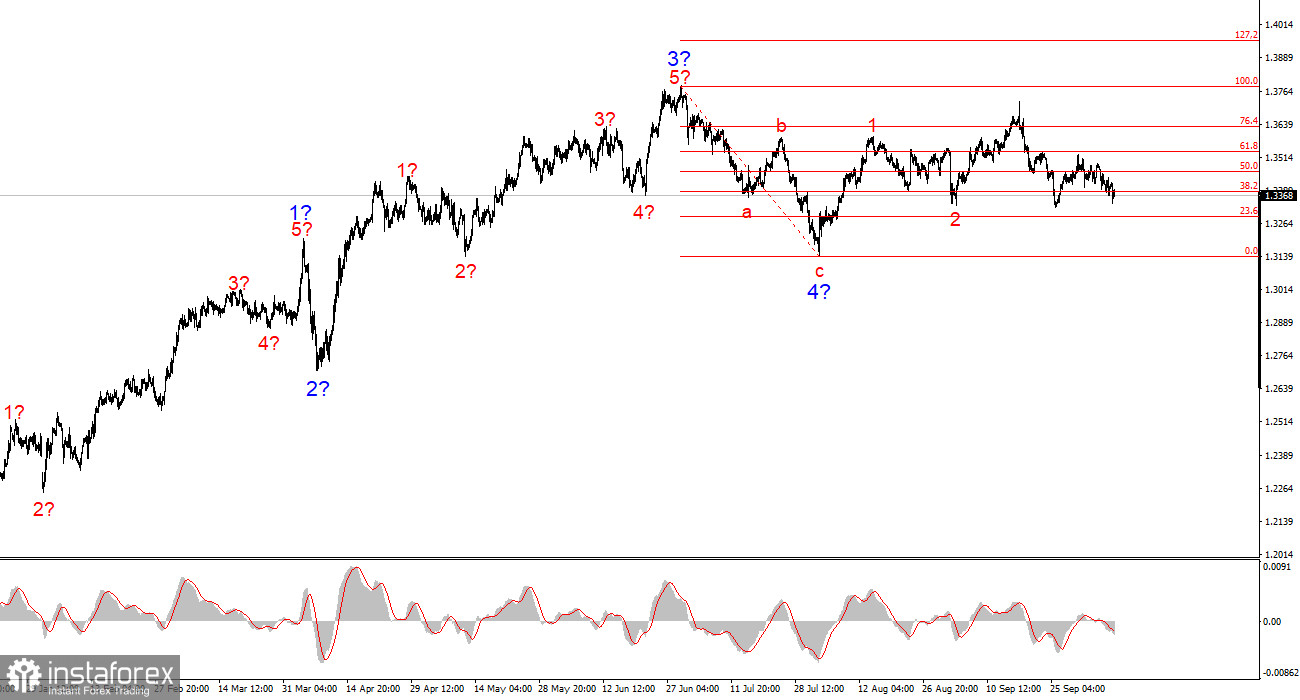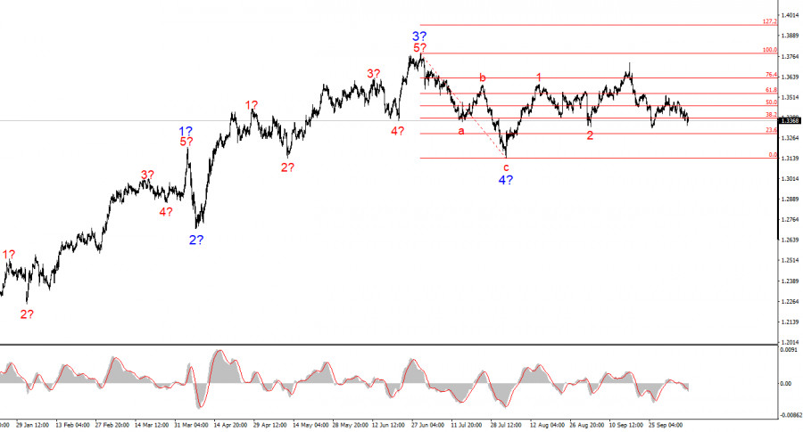 Курс инструмента GBP/USD продолжает снижаться, ломая текущую волновую разметку. Если бы новостной фон резко развернулся на 180 градусов для доллара США, все было бы ясно и понятно. Волновая разметка – это важный элемент анализа, но с глобальными событиями в мире тоже не поспоришь. Однако, на мой взгляд, новостной фон для доллара остается очень слабым, каким он и был весь 2025 год. Напомню, что только за 9 дней октября валюта США столкнулась с «шатдауном», слабыми индексами деловой активности ISM в сферах услуг и производства, совершенно провальным отчетом ADP. На этой неделе вышел протокол FOMC, который подтвердил ожидания рынка о готовности ФРС продолжать смягчение.