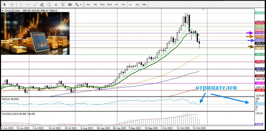А с технической точки зрения, принятие цены ниже психологического уровня $4000, и то, что индекс относительной силы дневном графике начал набирать отрицательную динамику, подтверждает вероятность дальнейшего снижения цены драгоценного металла.