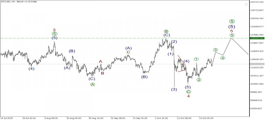 Предполагается, что в ближайшее время мы увидим рост в подволнах [3]-[4]-[5], как показано на графике в направлении ценового уровня 126000.00. Ранее на указанной отметке была завершена коррекционная подволна [B].