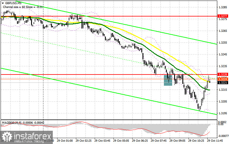 В своем утреннем прогнозе я обращал внимание на уровень 1.3228 и планировал от него принимать решения по входу в рынок. Давайте посмотрим на 5-минутный график и разберемся с тем, что там произошло. Снижение и формирование ложного пробоя в районе 1.3228 привели к точке входа на покупку фунта, но до роста пары дело так и не дошло, что вылилось в фиксацию убытков. На вторую половину дня техническая картина была пересмотрена.