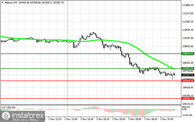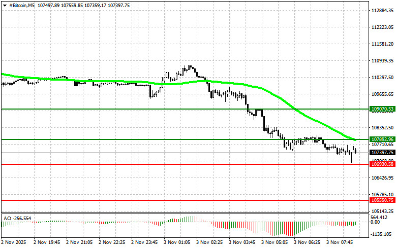 Сценарий №2: покупать биткоин можно от нижней границы $106 900 при отсутствии рыночной реакции на ее пробой в обратную сторону к уровням $107 800 и $109 000.