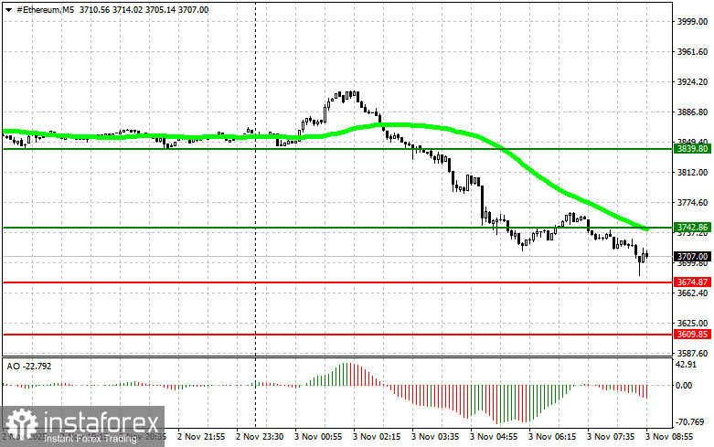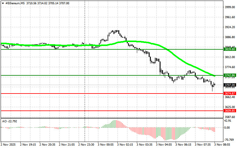 Сценарий №2: покупать эфир можно от нижней границы $3674 при отсутствии рыночной реакции на ее пробой в обратную сторону к уровням $3742 и $3839.