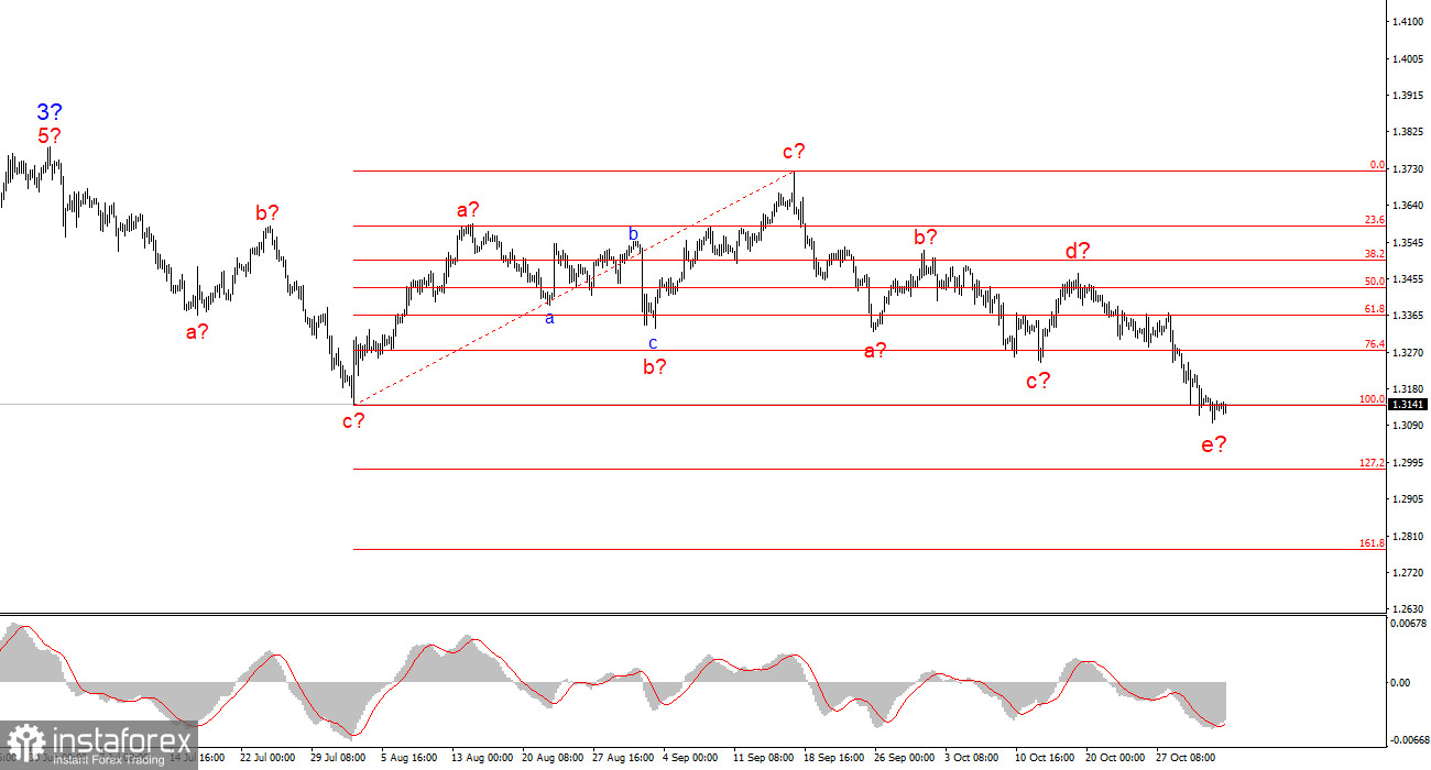 Волновая картина инструмента GBP/USD видоизменилась. Мы продолжаем иметь дело с повышательным, импульсным участком тренда, но его внутренняя волновая структура приобретает более сложный вид. Волна 4 принимает трехволновой вид, и ее структура получается в разы протяженнее, чем у волны 2. Очередная понижательная коррекционная структура близится к своему завершению. Я продолжаю ожидать, когда основная волновая структура возобновит свое построение с первоначальными целями около 38 и 40 фигур, и считаю, что это может произойти уже в начале ноября.