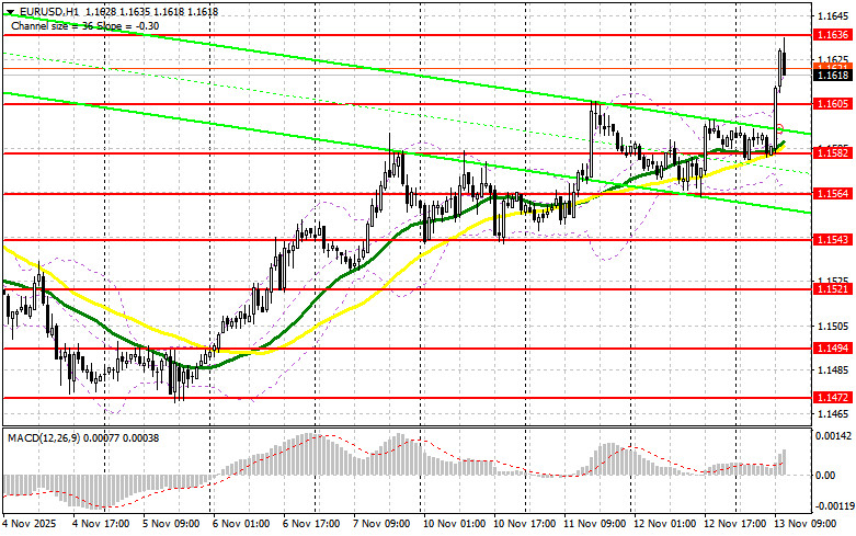 Евро продолжил рост против доллара, что указывает на возврат спроса на рисковые активы после завершения шатдауна в США. Во второй половине дня нет важной фундаментальной статистики по США, так что все внимание вновь будет сосредоточено на выступлениях членов FOMC Альберто Мусалема и Бет М. Хэммак. Напомню, что разногласия внутри ФРС становятся только сильнее, так что четкой позиции в отношении процентных ставок у трейдеров пока нет. В случае нисходящей коррекции пары формирования ложного пробоя в районе ближайшей поддержки 1.1605 будет достаточно для открытия длинных позиций в расчете на рост к сопротивлению 1.1636, выбраться выше которого в первой половине дня так и не удалось. Прорыв и обратный тест этого диапазона сверху вниз станут подтверждением правильной точки вход с движением к области 1.1668. Самой дальней целью будет уровень 1.1696, где буду фиксировать прибыль. При варианте снижения EUR/USD и отсутствия активности в районе 1.1605, давление на евро возрастет. Медведи в таком случае сумеют дотянуться до 1.1582. Лишь после формирования там ложного пробоя собираюсь действовать на покупку евро. Открывать длинные позиции сразу на отскок планирую от 1.1543 с целью восходящей коррекции в 30-35 пунктов внутри дня.