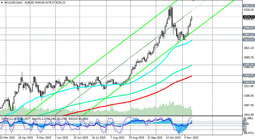 Сегодня золото продолжает уверенно подниматься в цене, преодолев отметку в 4240.00 долларов и показывая пятую сессию непрерывного роста. Цена во многом отыграла недавние потери, когда в октябре она рухнула с исторического максимума около 4380.00. Трейдеры связывают этот тренд с соглашением о завершении длительного шатдауна американского правительства и растущими ожиданиями дальнейшего смягчения денежно-кредитной политики Федеральной резервной системы США.