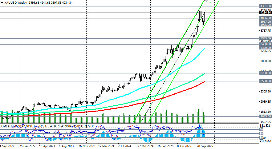 Технические индикаторы (в нашем случае это – RSI, OsMA, Стохастик) на дневном графике развернулись на длинные позиции, а цена тестирует зону сопротивления в диапазоне 4230.00 – 4250.00.