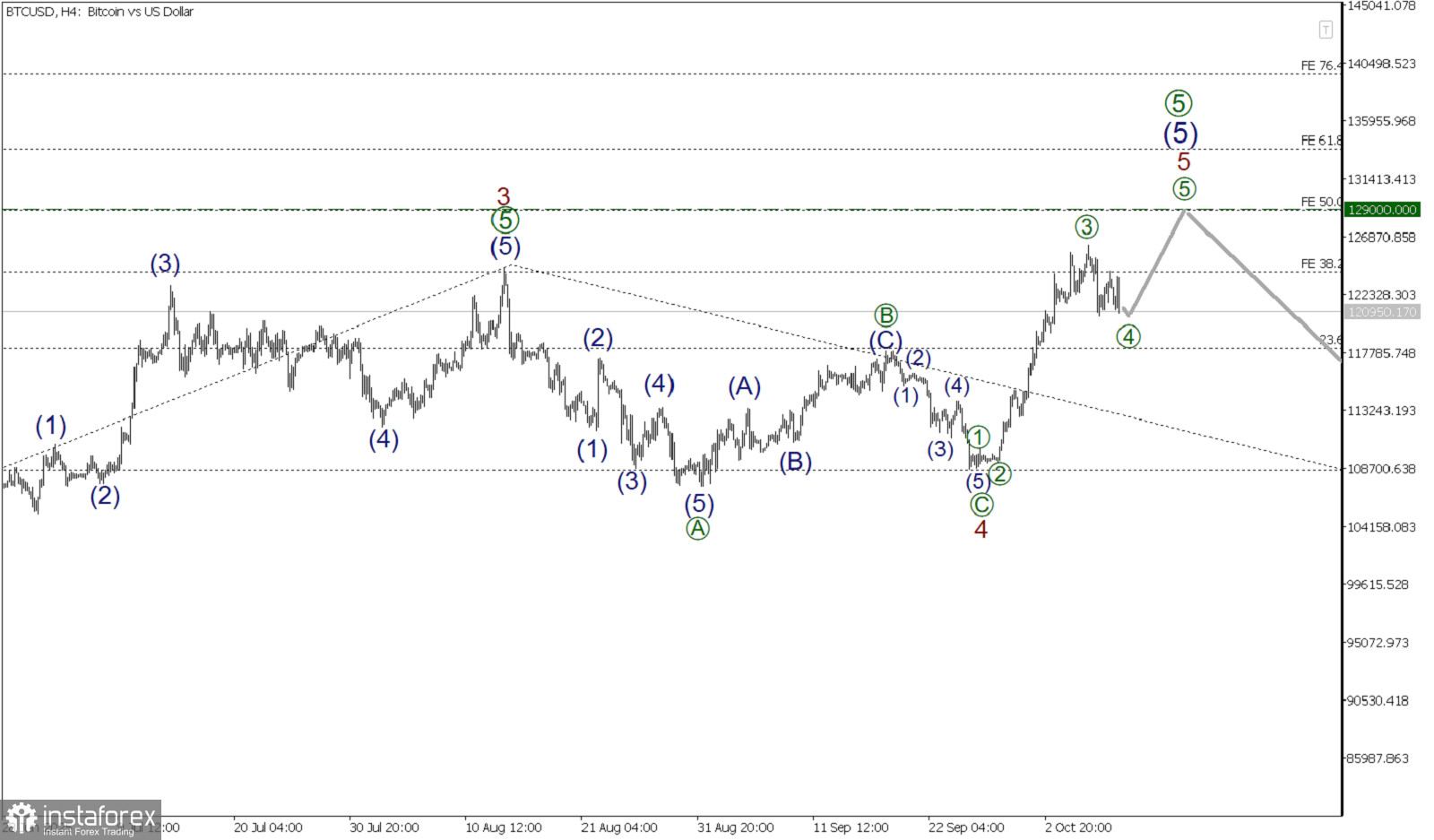 В долгосрочной перспективе по криптовалютной паре BTC/USD может формироваться крупный бычий импульс 1-2-3-4-5. Большая часть указанной фигуры полностью завершена. Сейчас в стадии разработки находится коррекционная волна 4. Волна 4 может принять форму стандартного зигзага [A]-[B]-[C]. Есть большая вероятность, что коррекция 4 уже закончена, сейчас цена движется вверх в импульсе 5. Внутри потенциального импульса завершены подволны [1]-[2]-[3]-[4]. В ближайшее время ожидается рост в финальной подволне [5] в направлении уровня 129000.00. На указанной отметке величина волны 5 может составить 50% по линиям Фибоначчи от предыдущего импульса 3. В такой ситуации возможен рост к ценовой отметке 129000.00. Таким образом можно рассматривать открытие длинных позиций с текущего уровня.