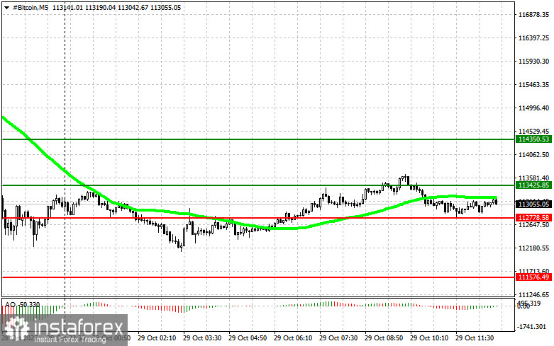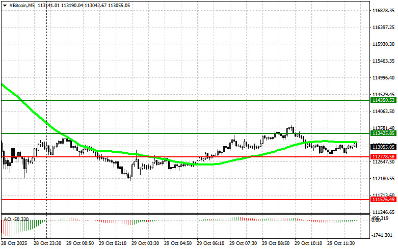 Сценарий №2: продавать биткоин можно от верхней границы $113 400 при отсутствии рыночной реакции на ее пробой в обратную сторону к уровням $112 700 и $111 500.