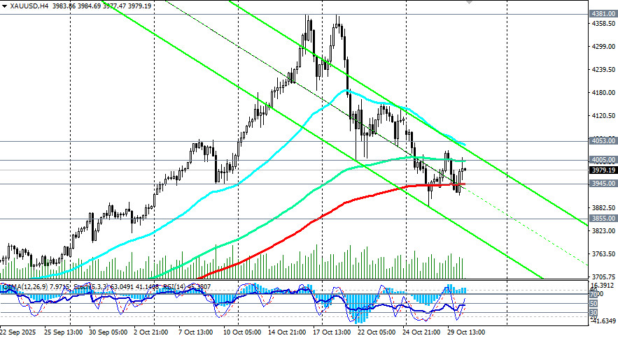 Пробой же поддержки на уровнях 3945.00 (ЕМА200 на 4-часовом графике), 3900.00 («круглый» уровень) может спровоцировать снижение к уровню 3855.00, от которого можно будет вновь рассчитывать на отбой и возобновление роста.