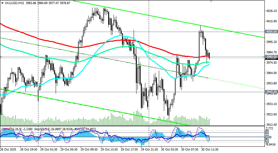 Пока доллар продолжает укрепляться, а его индекс – расти, повышаясь в зоне выше отметки 99.00, пара XAU/USD, на момент публикации данной статьи, нашла временную поддержку на уровне 3980.00 (ЕМА200 на 15-минутном графике).