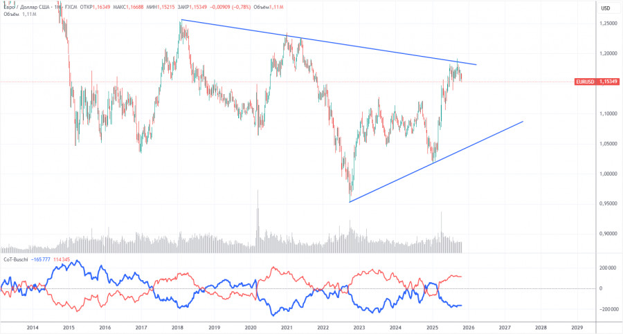 Последний отчет COT датирован 23 сентября. С тех пор больше отчетов COT не публиковалось из-за «шатдауна» в США. На иллюстрации выше отлично видно, что нетто-позиция некоммерческих трейдеров долгое время была «бычьей», медведи с трудом перешли в зону собственного превосходства в конце 2024 года, но очень быстро ее потеряли. С тех пор, как Трамп вступил в должность президента США во второй раз, падает только доллар. Мы не можем сказать, что падение американской валюты продолжится с вероятностью 100%, но текущее развитие событий в мире намекает именно на этот вариант.