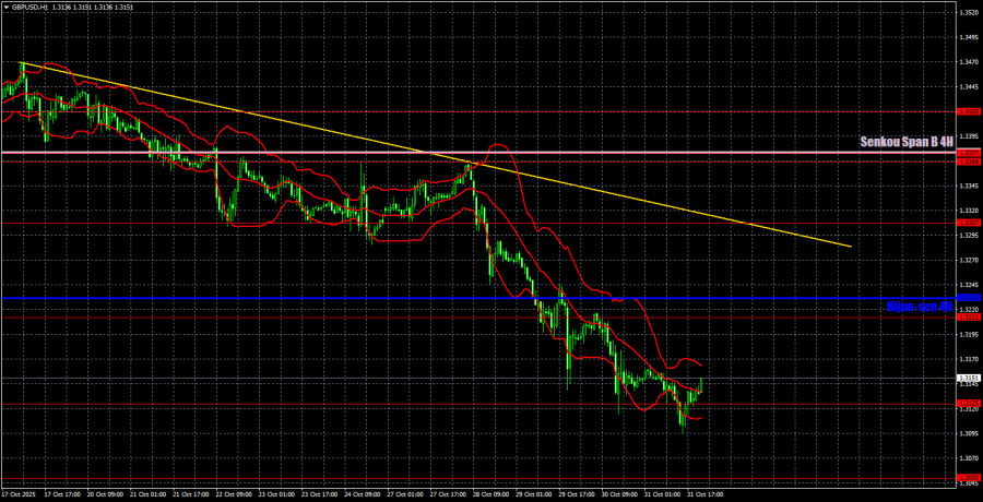 На часовом таймфрейме пара GBP/USD продолжает формирование нового нисходящего тренда. У доллара по-прежнему нет глобальных причин укрепляться, поэтому мы ожидаем роста пары к максимумам 2025 года практически в любом случае. Главное – чтобы флэт на дневном ТФ завершился как можно скорее. Однако на часовом ТФ тенденция теперь нисходящая, поэтому, как минимум, нужно ожидать преодоления линии тренда и линии Сенкоу Спан Б, чтобы иметь технические основания ожидать рост британской валюты.