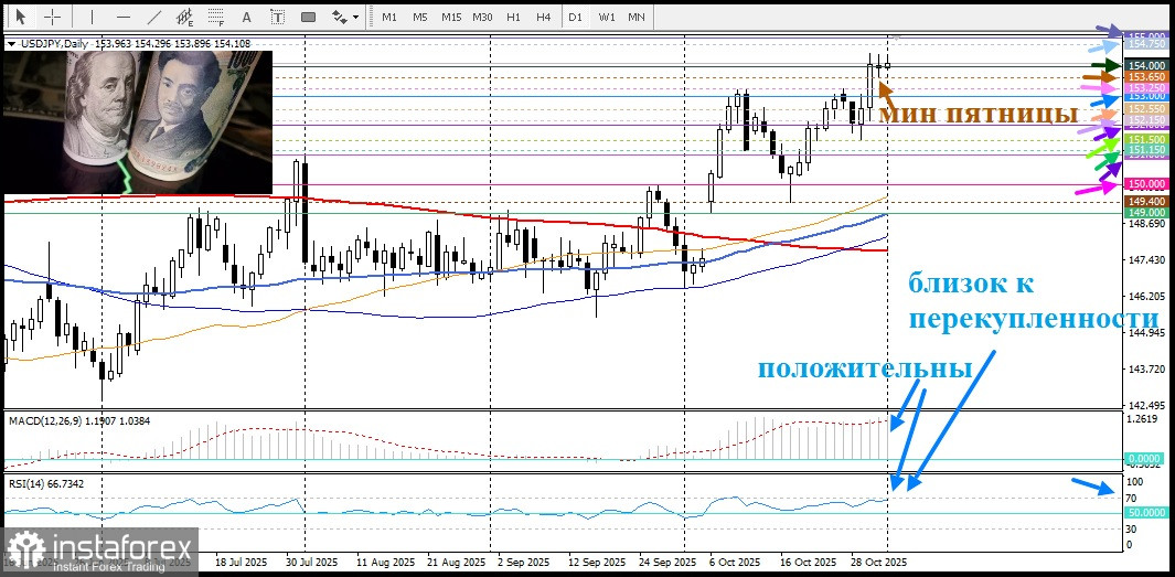 Сегодня пара торгуется в привычном диапазоне пятницы. С технической точки зрения, прорыв на прошлой неделе уровня 153,25–153,30 и последующее укрепление выше круглого уровня 154,00 стали основными факторами для роста пары USD/JPY. Более того, осцилляторы на дневном графике уверенно держатся на положительной территории. Это, подтверждает вероятность роста пары к сопротивлению 154,75–154,80 на пути к психологическому уровню 155,00. Тем не менее, стоит обратить внимание, что RSI-индекс относительной силы на этом же графике близок к зоне перекупленности, предупреждая о консолидации или коррекции, перед следующим движении вверх.