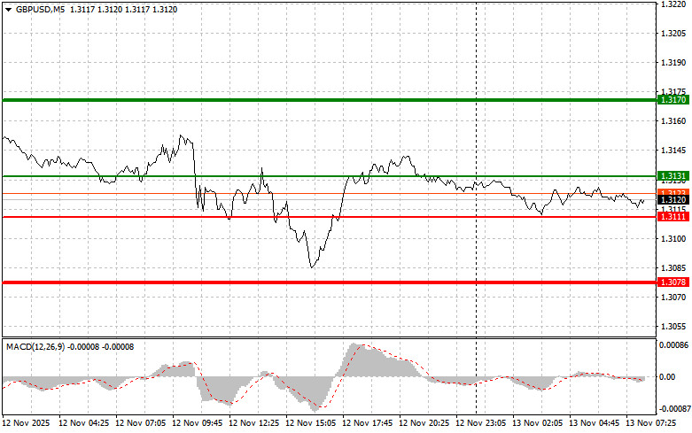 Сценарий №2: покупать фунт сегодня также планирую в случае двух подряд тестов цены 1.3111 в момент, когда индикатор MACD будет находиться в области перепроданности. Это ограничит нисходящий потенциал пары и приведет к обратному развороту рынка вверх. Можно ожидать рост к противоположным уровням 1.3131 и 1.3170.