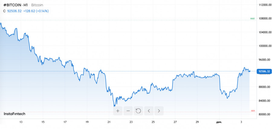 Параллельно криптовалютный рынок продемонстрировал впечатляющий отскок. Биткоин достиг 2-недельного максимума – $93 633, укрепившись на 2% за сутки. На фоне роста на 6% днем ранее, крупнейшая криптовалюта вернулась выше $91 000, оттолкнувшись от понедельничных минимумов ниже $85 000. Стоит отметить, что в ноябре биткоин пережил резкое снижение более чем на $18 000 – крупнейшее в долларовом выражении с мая 2021 года.