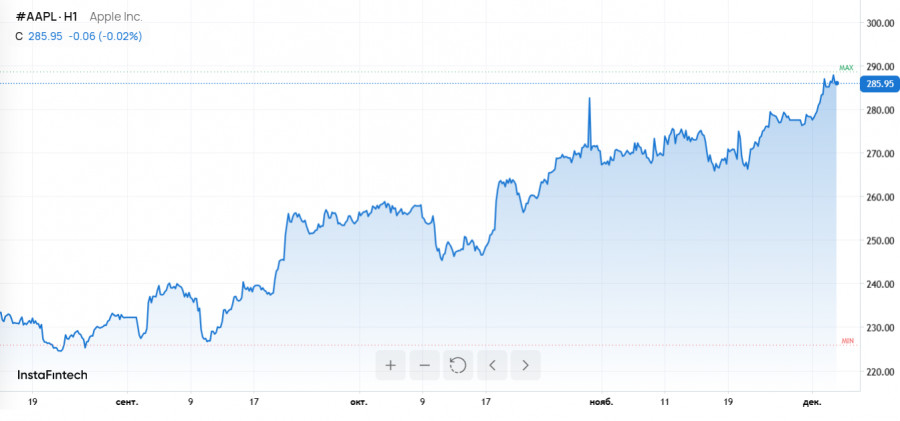 Во вторник бумаги Apple закрылись на историческом пике в $286,19, поставив жирную точку в семидневной серии роста. Внутридневной максимум составил $287,40 – это один из самых устойчивых подъемов акций с мая текущего года. Рыночная капитализация технологической корпорации достигла $4,247 триллиона, что делает её второй по величине компанией в мире после Nvidia.
