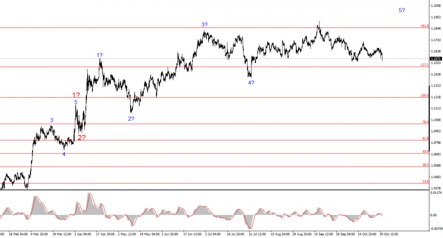 Построение повышательного участка тренда продолжается, а новостной фон продолжает поддерживать по большей части не доллар. Торговая война, начатая Дональдом Трампом, продолжается. Противостояние президента с ФРС продолжается. «Голубиные» ожидания рынка по ставке ФРС остаются высокими, особенно на 2026 год. В Америке продолжается «шатдаун». Рынок труда «охлаждается».