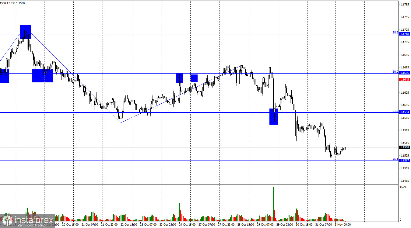 Đã có khả năng bán sau khi đóng cửa dưới mức 1.1645–1.1656 trên biểu đồ hàng giờ, với mục tiêu là 1.1594 - mục tiêu này đã đạt được. Các vị thế bán mới có thể được cân nhắc sau khi đóng cửa dưới 1.1594, với mục tiêu là 1.1517 - mục tiêu này cũng gần như đã đạt được. Cơ hội mua có thể được cân nhắc sau khi bật lại từ 1.1517, với mục tiêu là 1.1594.